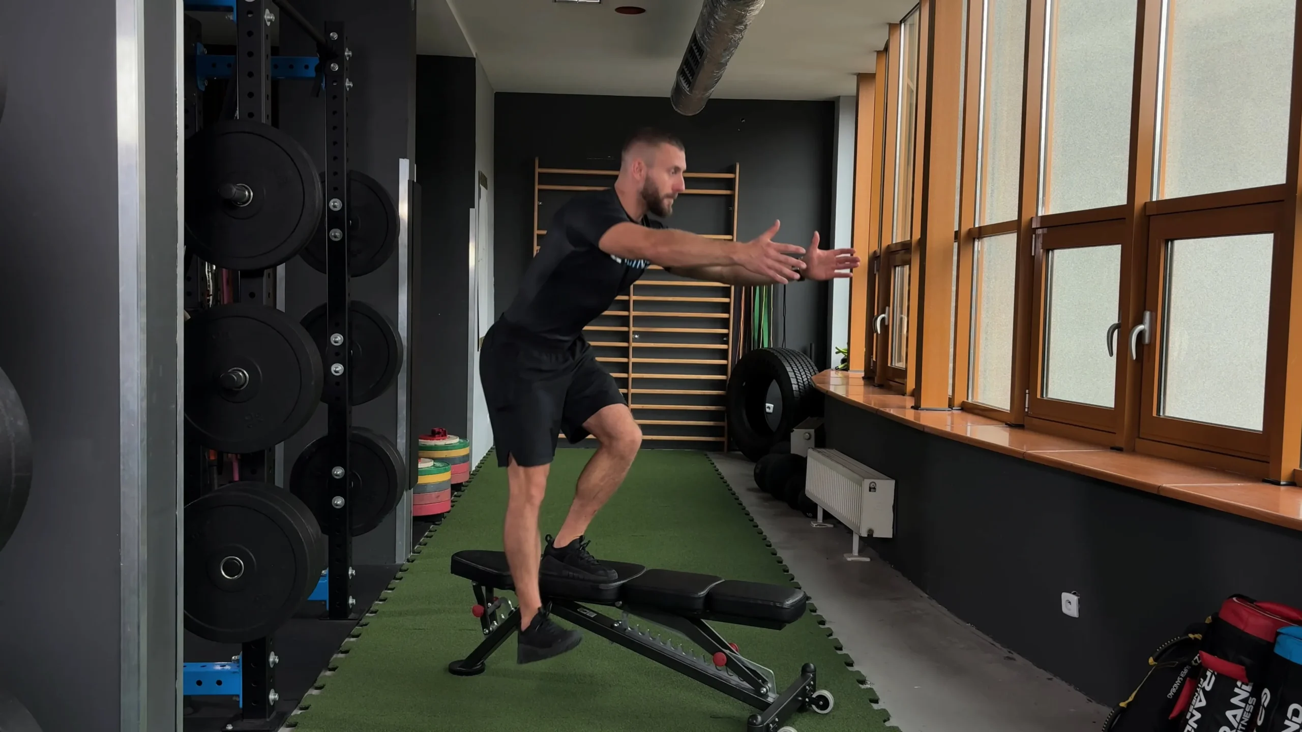 Przysiady jednonóż stojąc na ławce
