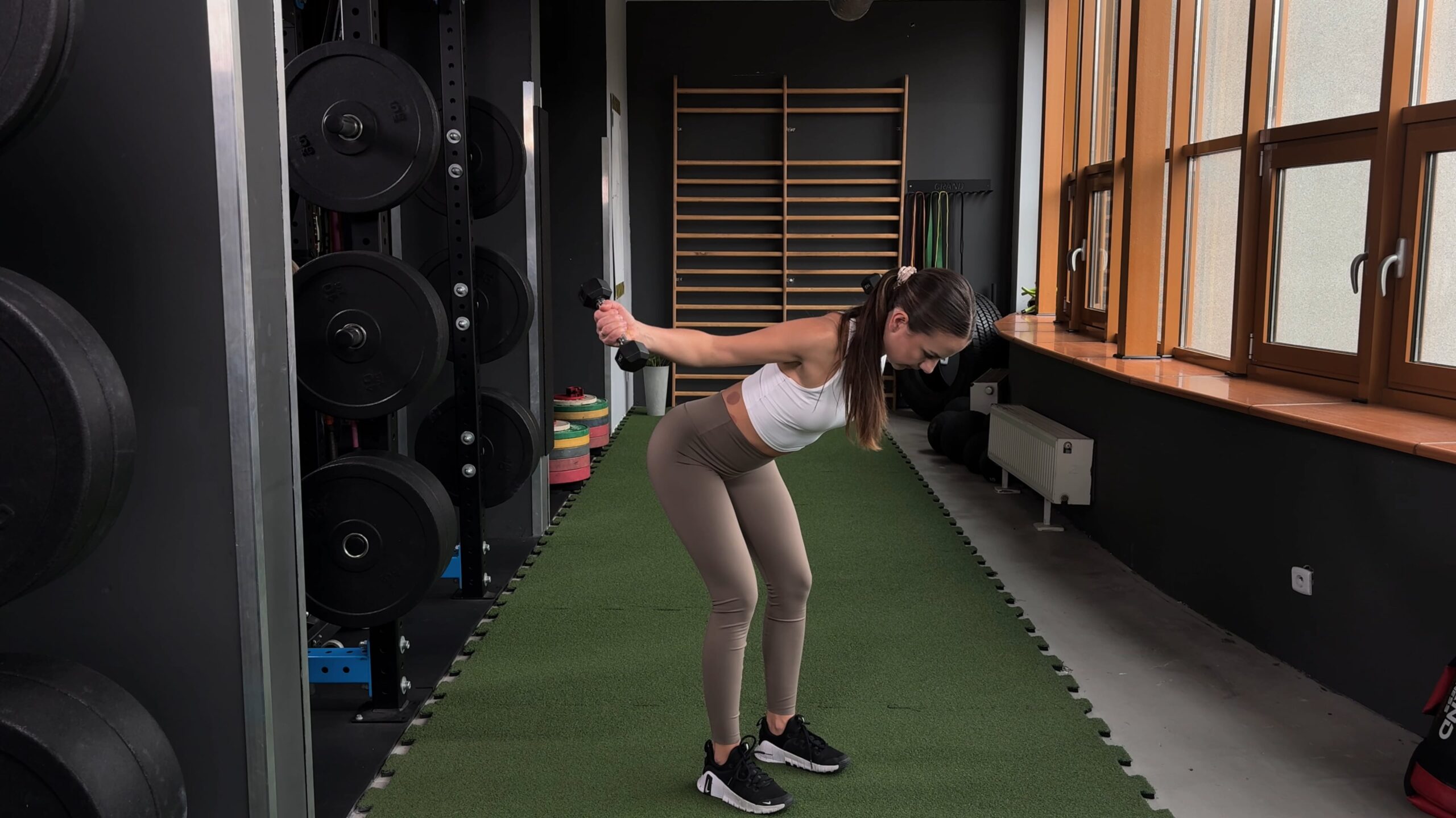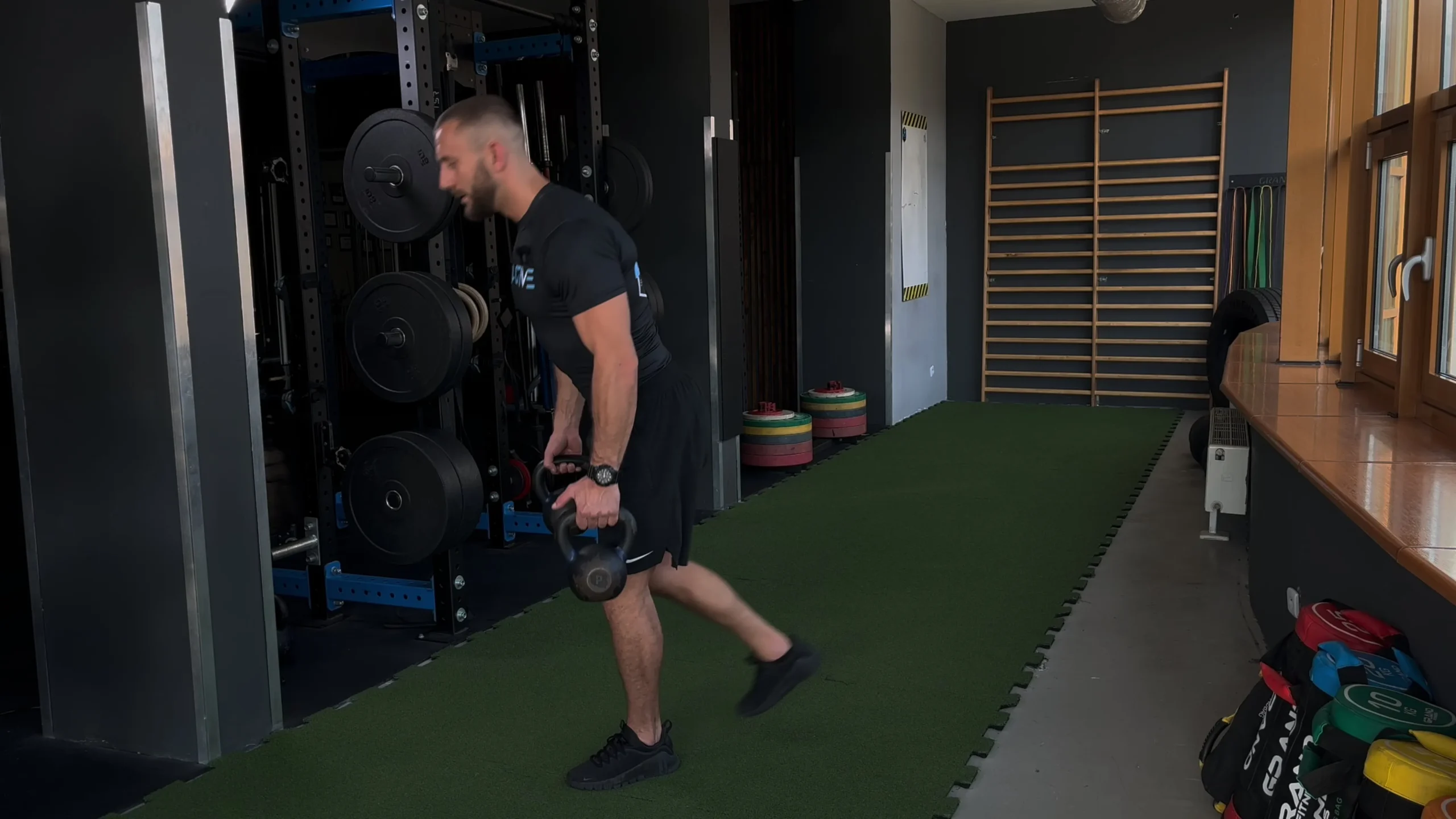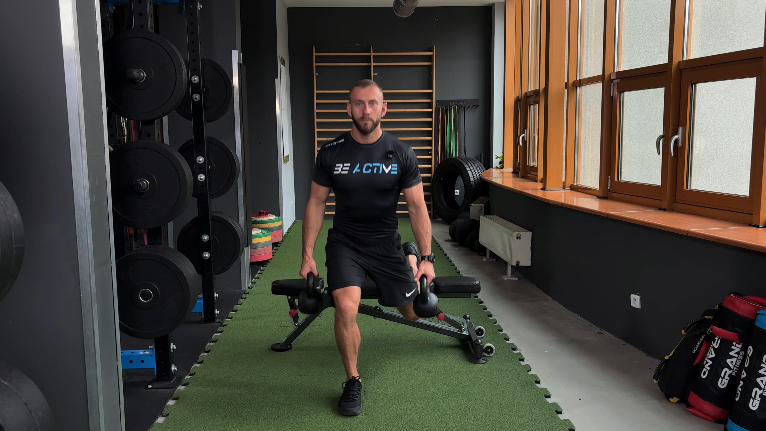 Przysiad bułgarski z kettlem po przeciwnej stronie