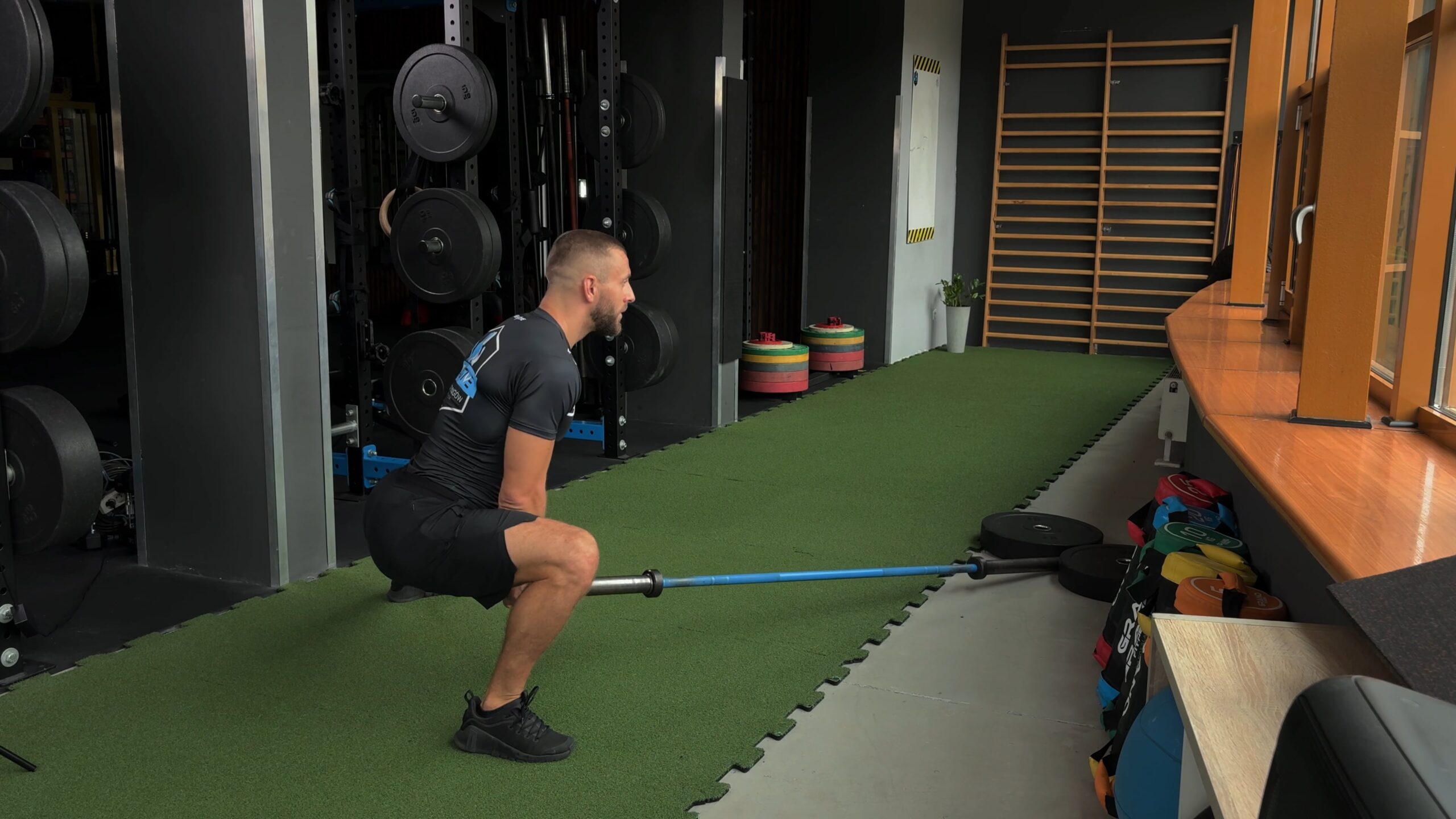 Wykroki boczne z półsztangą trzymaną na wysokości bioder