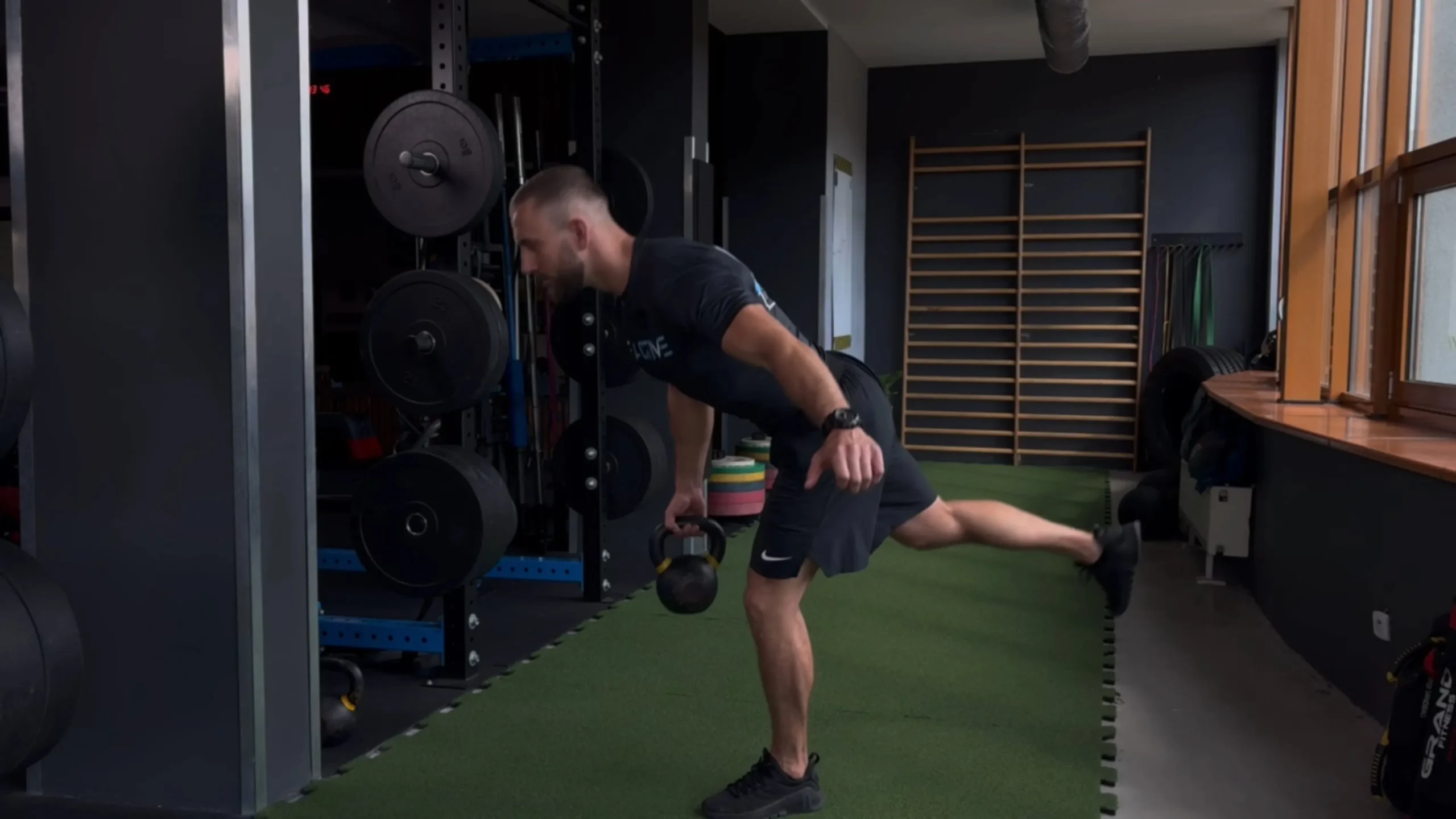 Martwy ciąg jednonóż z kettlem po przeciwnej stronie