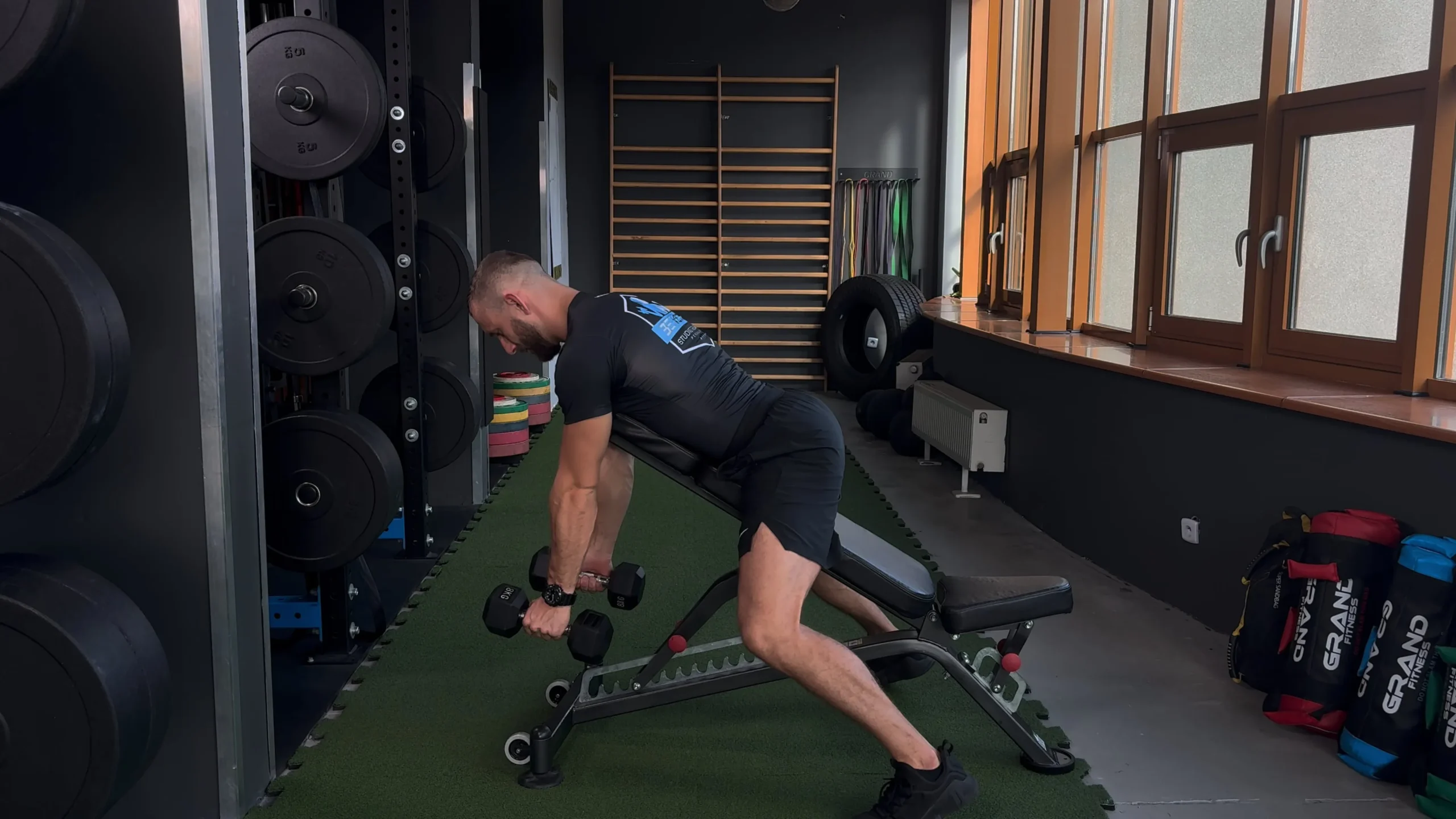 Naprzemienne wiosłowanie hantlami w leżeniu na ławce skośnej dodatniej z przytrzymaniem