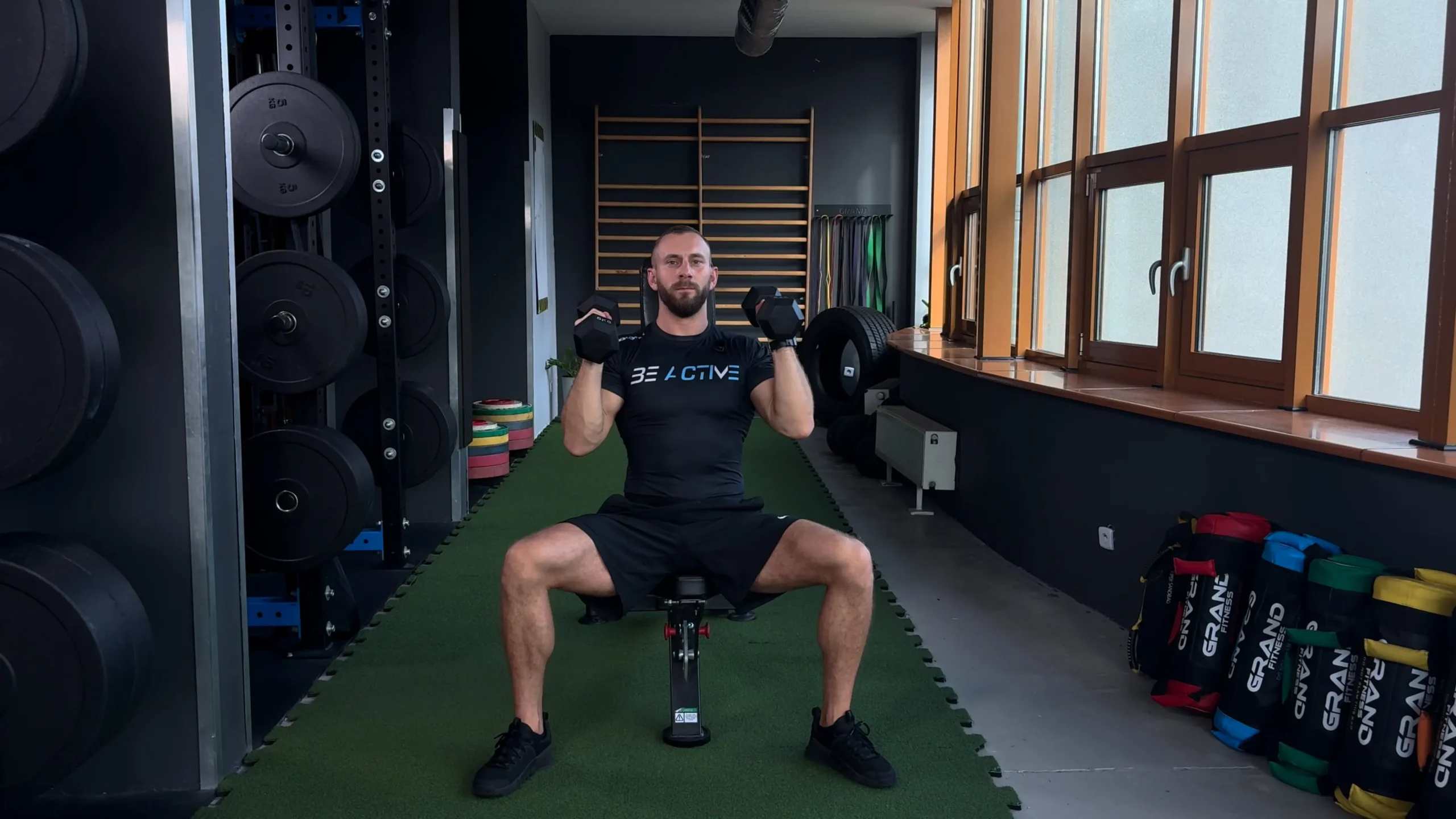 Naprzemienne wyciskanie hantli nad głowę chwytem neutralnym siedząc