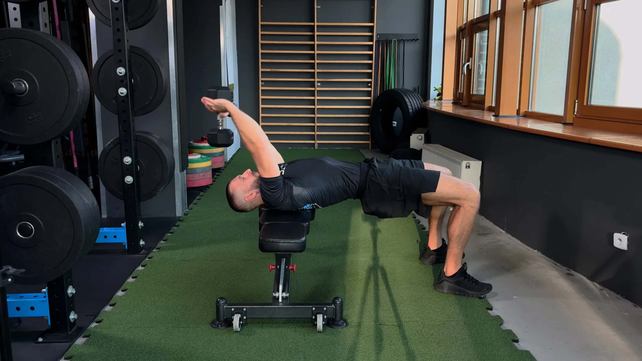 Przenoszenie hantla za głowę w oparciu o ławkę