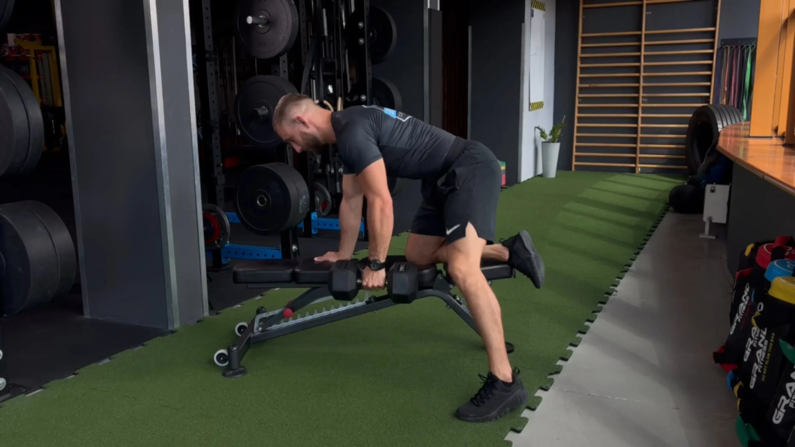 Wiosłowanie hantlą szeroko (łokieć 60-90stopni) oparciu o ławkę