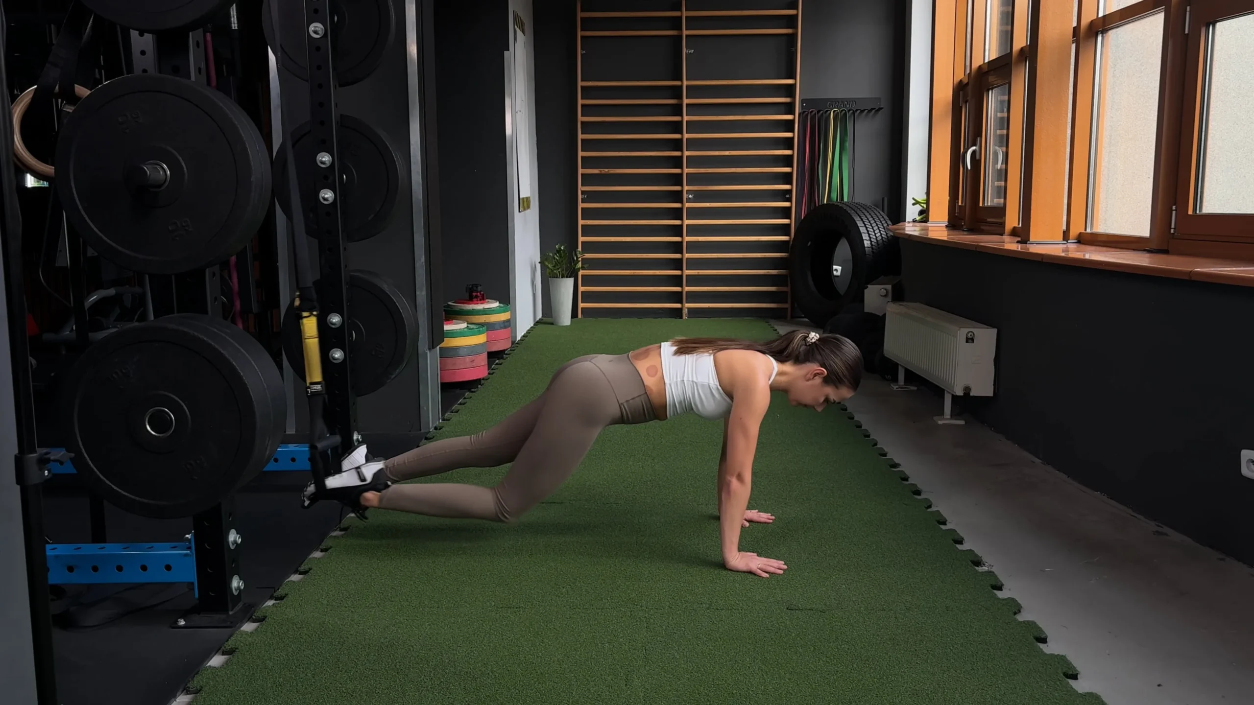 Przyciąganie kolan do klatki w podporze przodem z nogami na TRX