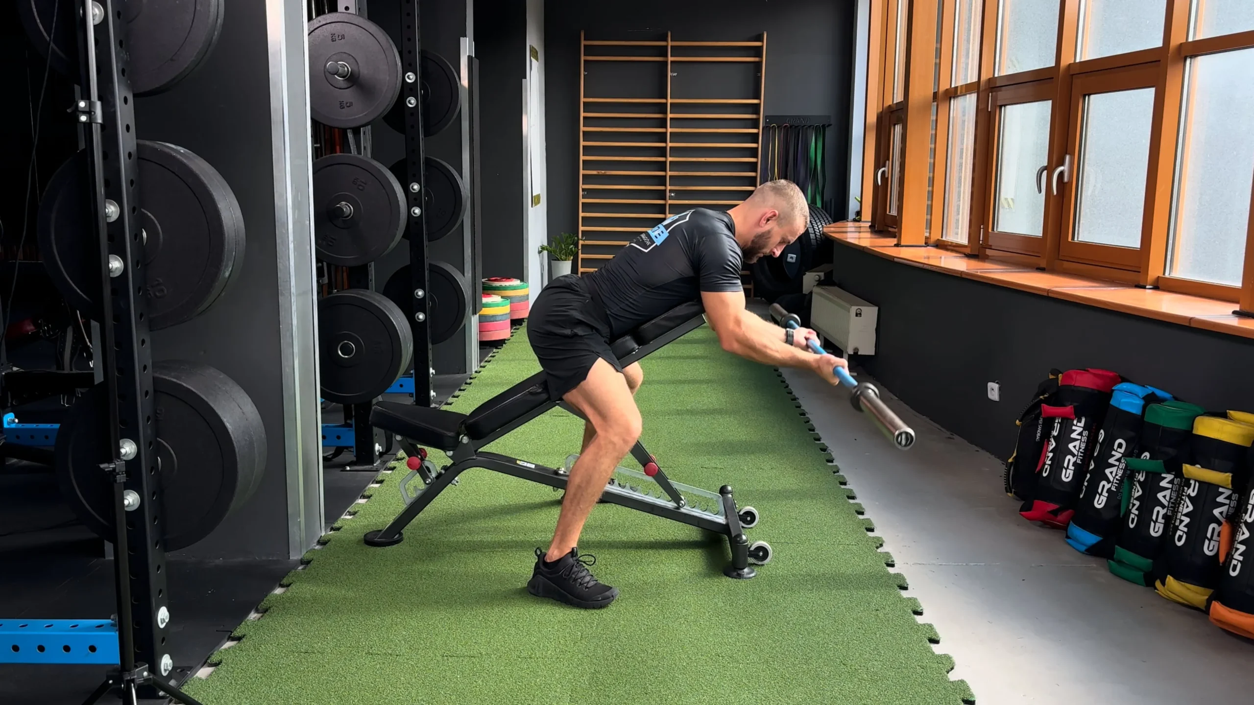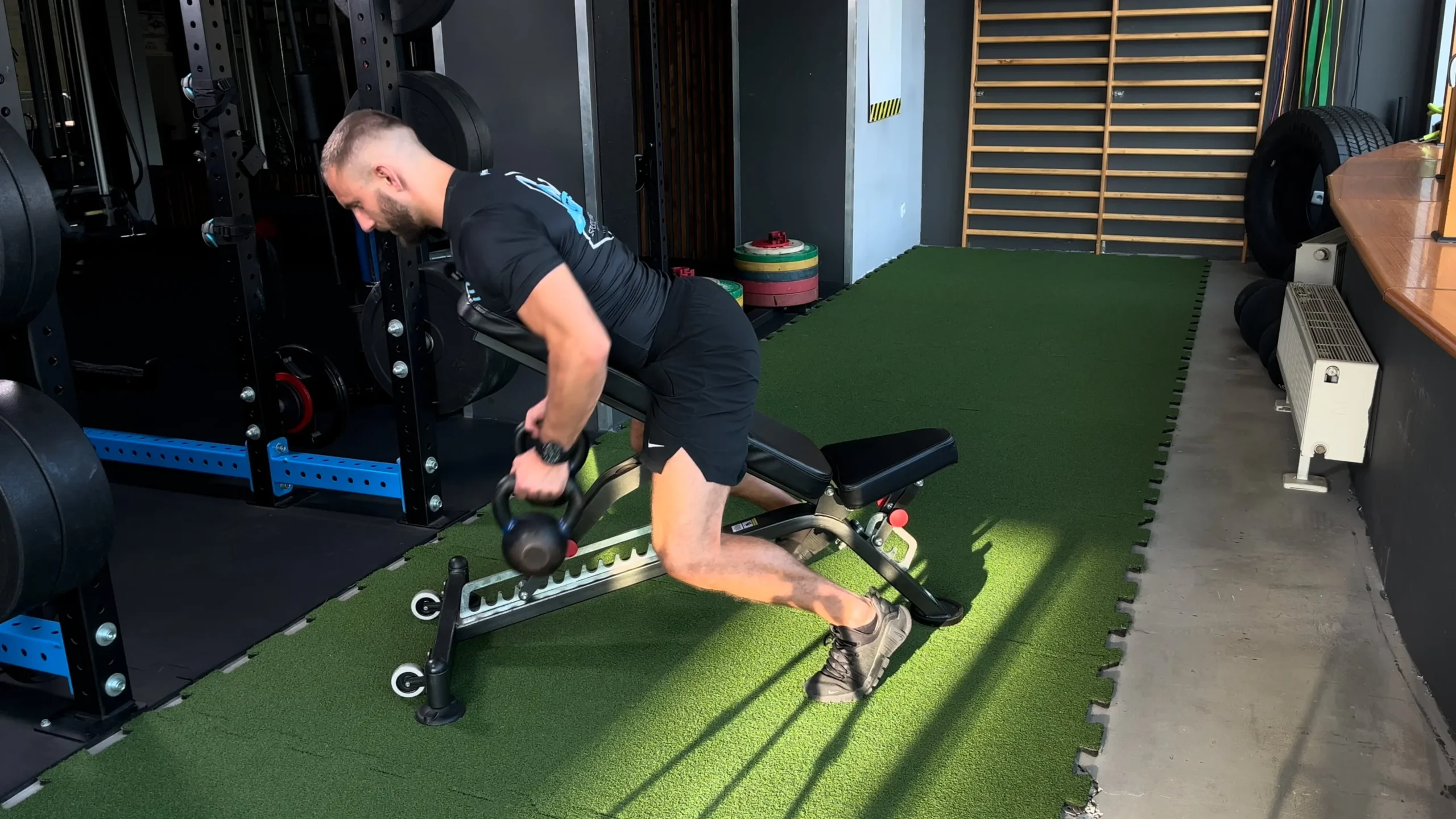 Wiosłowanie kettlami leżąc na ławce skośnej