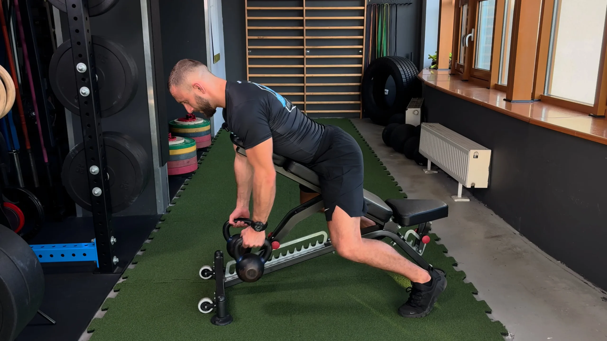 Naprzemienne wiosłowanie kettlami w leżeniu na ławce skośnej z przytrzymaniem