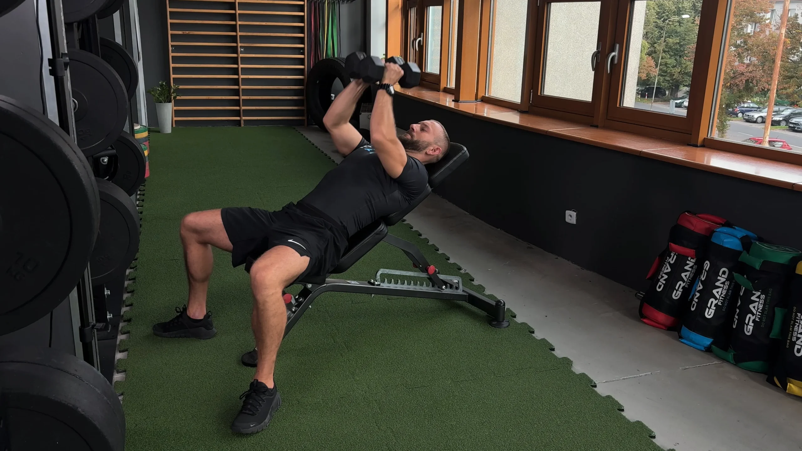 Wyciskanie złączonych hantli na ławce skośnej dodatniej