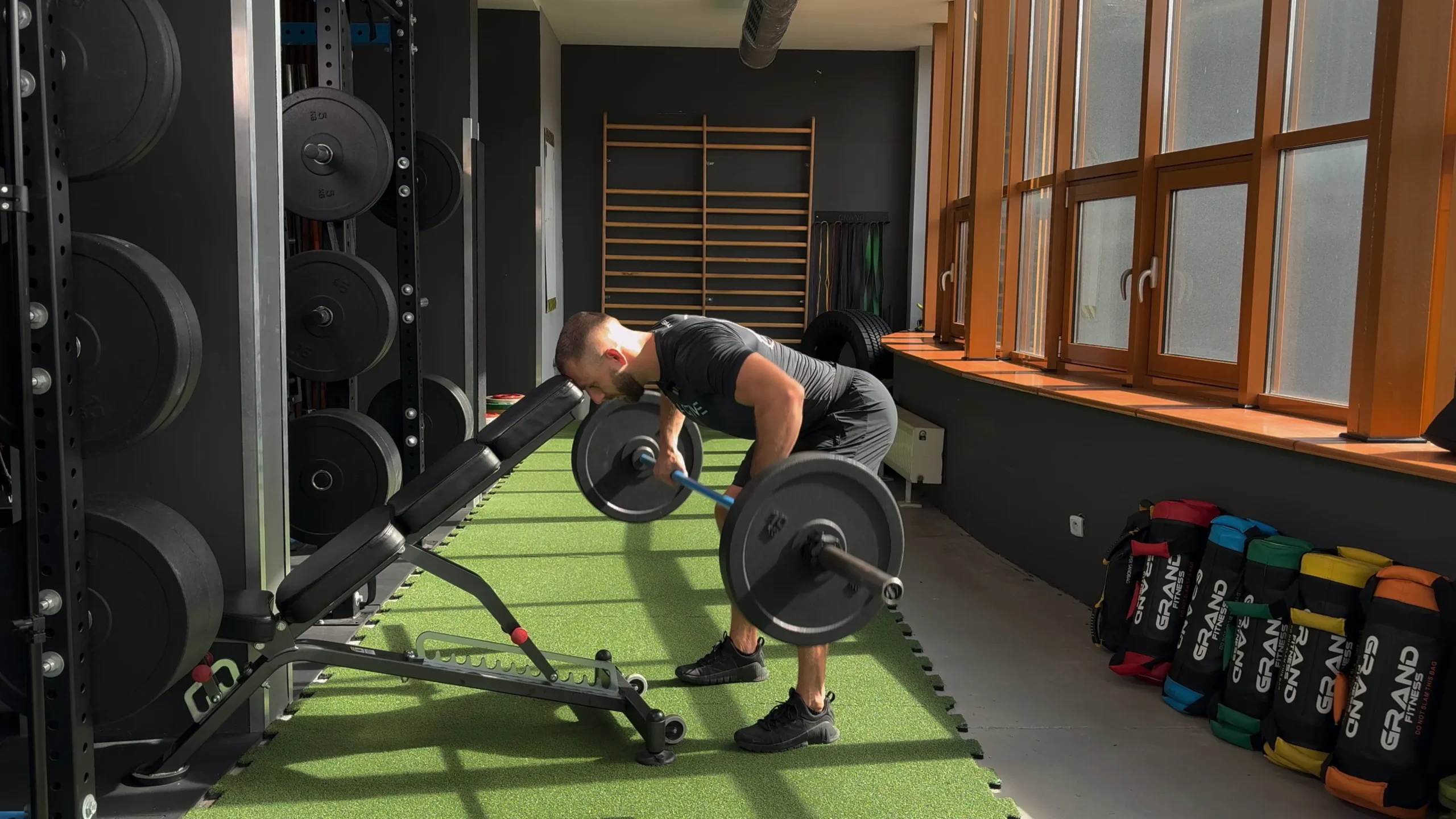 Wiosłowanie sztangą nachwytem w oparciu głową o ławkę