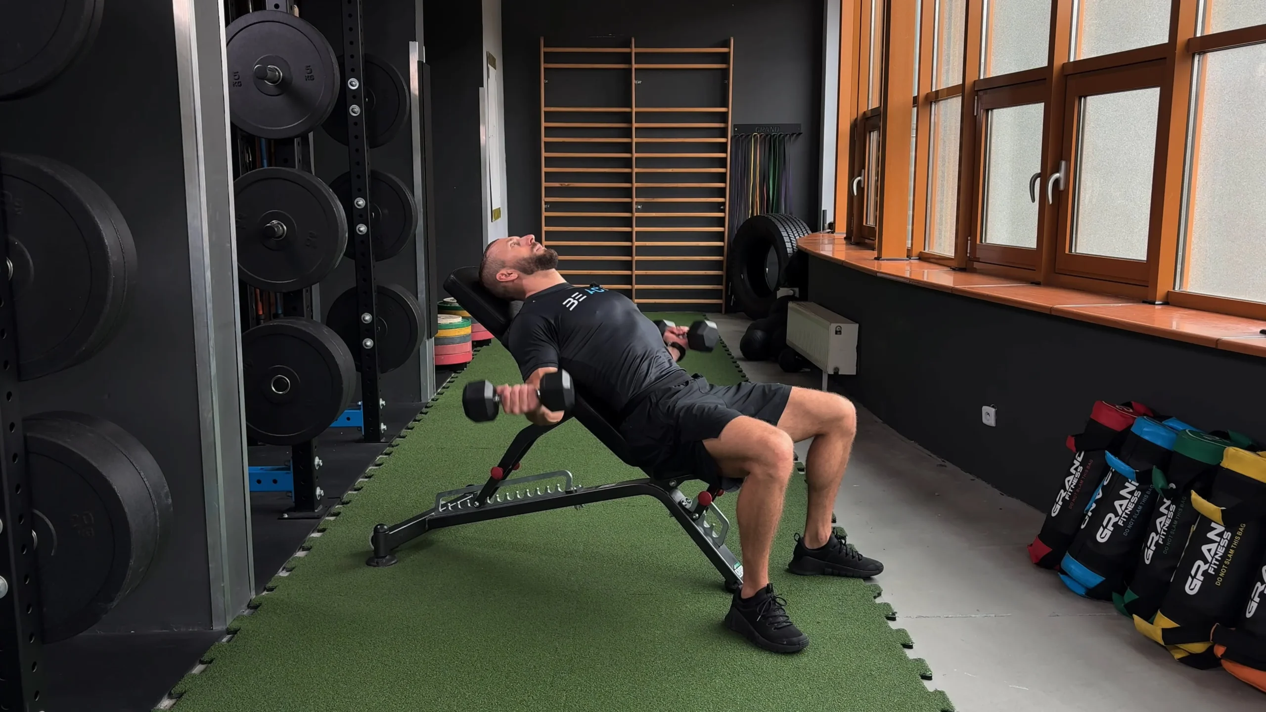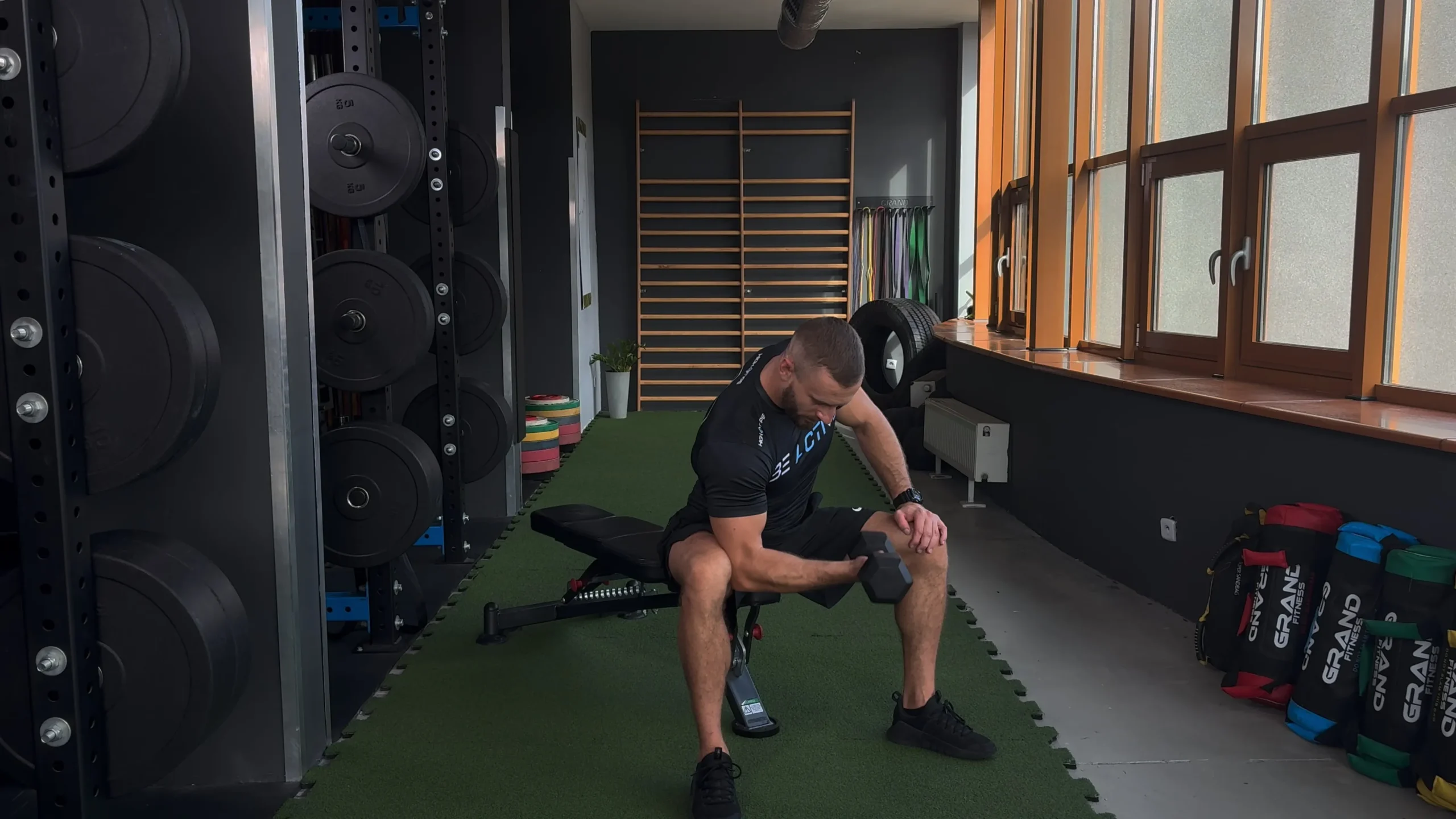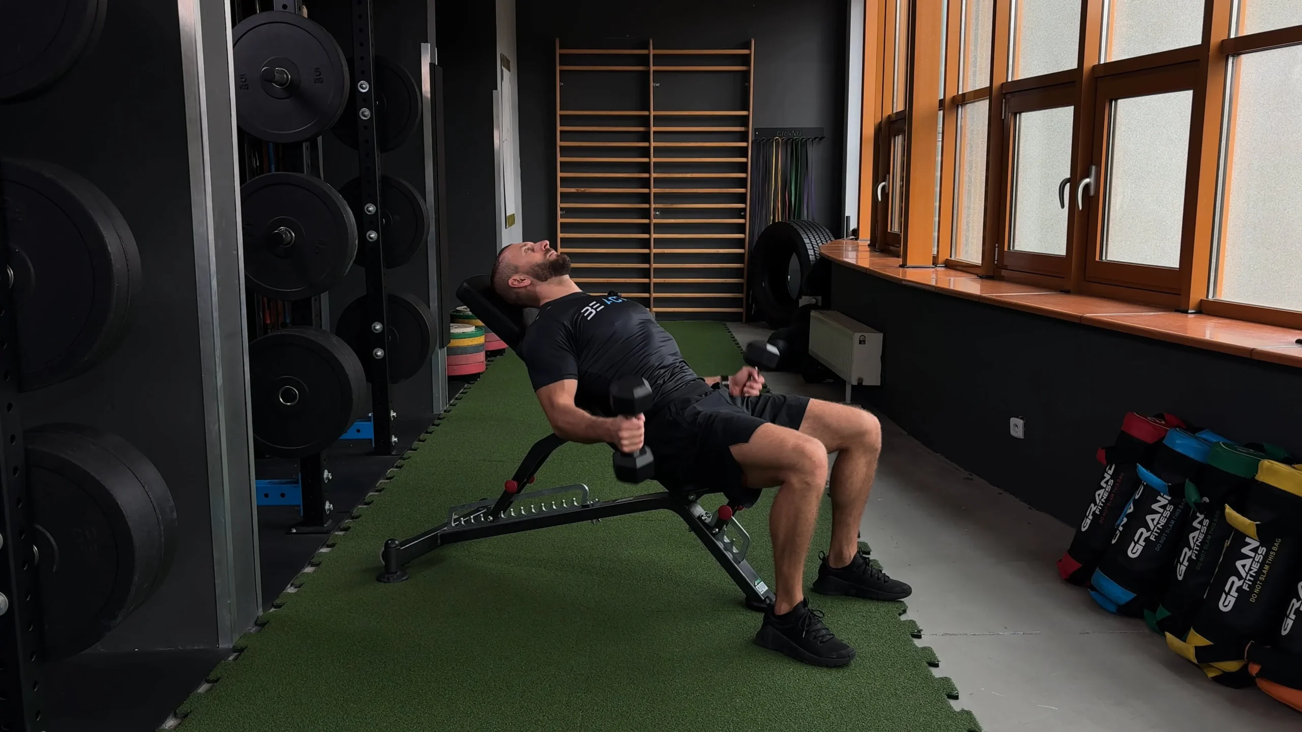 Uginanie ramion hantlami siedzac na ławce skośnej