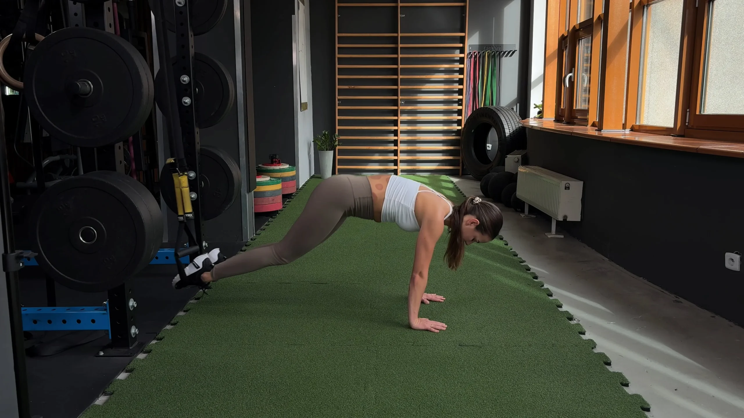 Unoszenie bioder w podporze przodem nogami na trx