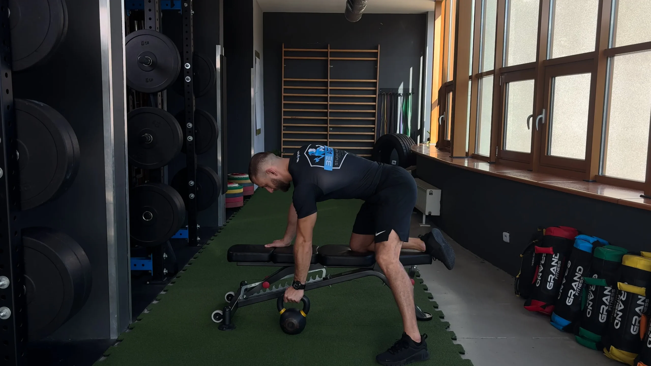 Wiosłowanie kettlem w oparciu o ławkę